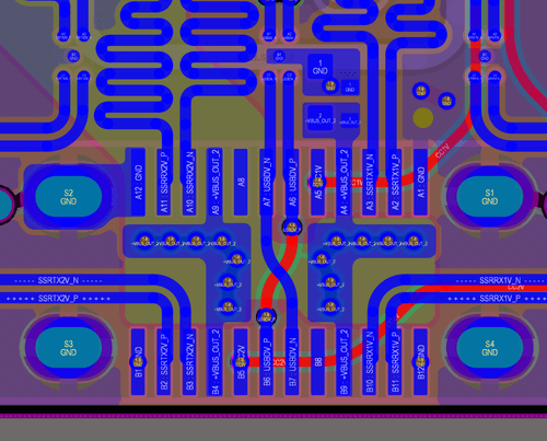In the sophisticated realm of USB-C design, particularly for USB 3.0 and 3.1 standards, the strategic handling of high-speed TX (transmit) and RX (receive) differential pairs is essential. These pairs, delineated as TX1+/TX1- with RX1+/RX1- and TX2+/TX2- with RX2+/RX2-, are essential for managing data transmission and reception in accordance with the connector's orientation.